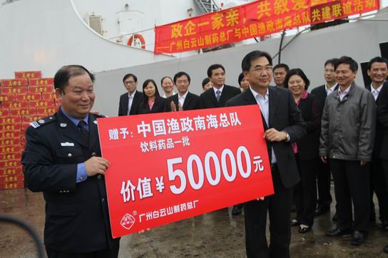 20121121日,,, , ,,,广药集团广州XPJ与中国渔政南海总队在中国渔政南海总队310渔政船上,,, , ,,,配合开展了以“政企一家亲,,, , ,,,共叙爱国情”为主题的共建联谊活动。。。。。。中国南海区渔政局副局长郭富锦、副巡视员(总队长)朱英荣、广药集团副总司理、XPJ总厂厂长陈矛,,, , ,,,XPJ总厂党委书记周志魁等向导以及双方单位干部及员工约130人加入了本次活动。。。。。。