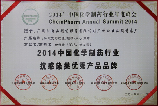 头孢克肟(世福素)获“2014中国化学制药行业抗熏染类优异产品品牌”