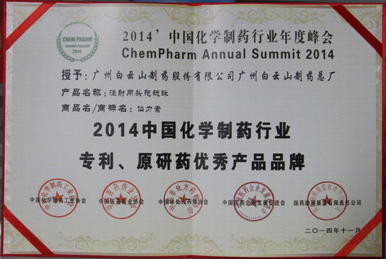 注射用头孢硫脒(仙力素)获“2014中国化学制药行业专利、原研药优异产品品牌”