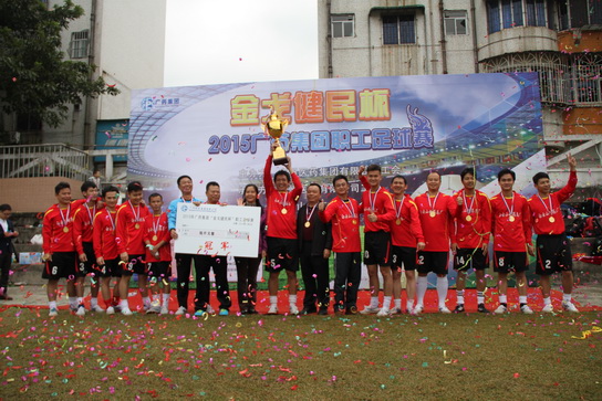 2015年11月21日上午,,,,,,,由广药集团工会主理、XPJ工会和广州医药有限公司工会承办的2015年广药集团“金戈健民杯”职工足球赛在XPJ足球场拉开序幕。。。。。。。集团下属企业通过自力组队或联合组队方法,,,,,,,组成12支步队参赛。。。。。。。12月6日,,,,,,,经由六天主要有序、激感人心的角逐,,,,,,,赛事迎来最后一个角逐日暨颁奖仪式,,,,,,,广药集团工会黄志恩主席、陆青副主席、简惠东副主席及各司属单位工会向导亲临现场为选手呐喊助威。。。。。。。最终XPJ夺得冠军,,,,,,,广州医药有限公司和王老吉药业划分获得亚军和季军。。。。。。。