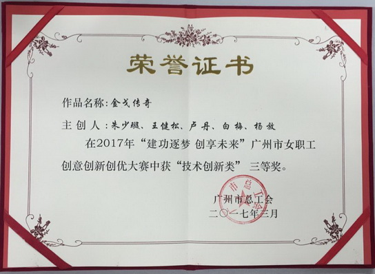 2月27日,,,,,,由广州市总工会主理的“立功逐梦 创享未来”2017年广州市女职工创意立异创优大赛在广州市工人文化宫举行。。。。。。大赛共有来自各行各业的63支步队、600多名女职工参赛。。。。。。XPJ以《金戈传奇》为参赛作品,,,,,,通过严谨详实的阐释质料、声情并茂的现场演绎、富厚生动的视频展示巧妙连系,,,,,,在手艺立异组30个参赛单位中脱颖而出,,,,,,荣获三等奖的好效果。。。。。。